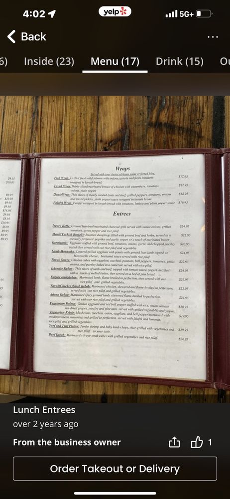“ We are still celebrating our birthday, me and daughter, we were born the same day, the 24th. Mustafá was our waiter, he was very good, at the end of our diner, he even sang for us the happy birthday song. Beef Kabab was amazing, I want to comeback for it, the spanakopitas too, we ordered a second one to go. The desert which I don't remember the name but is on the pictures, was to die for, kind of a baklava with ice cream. ”